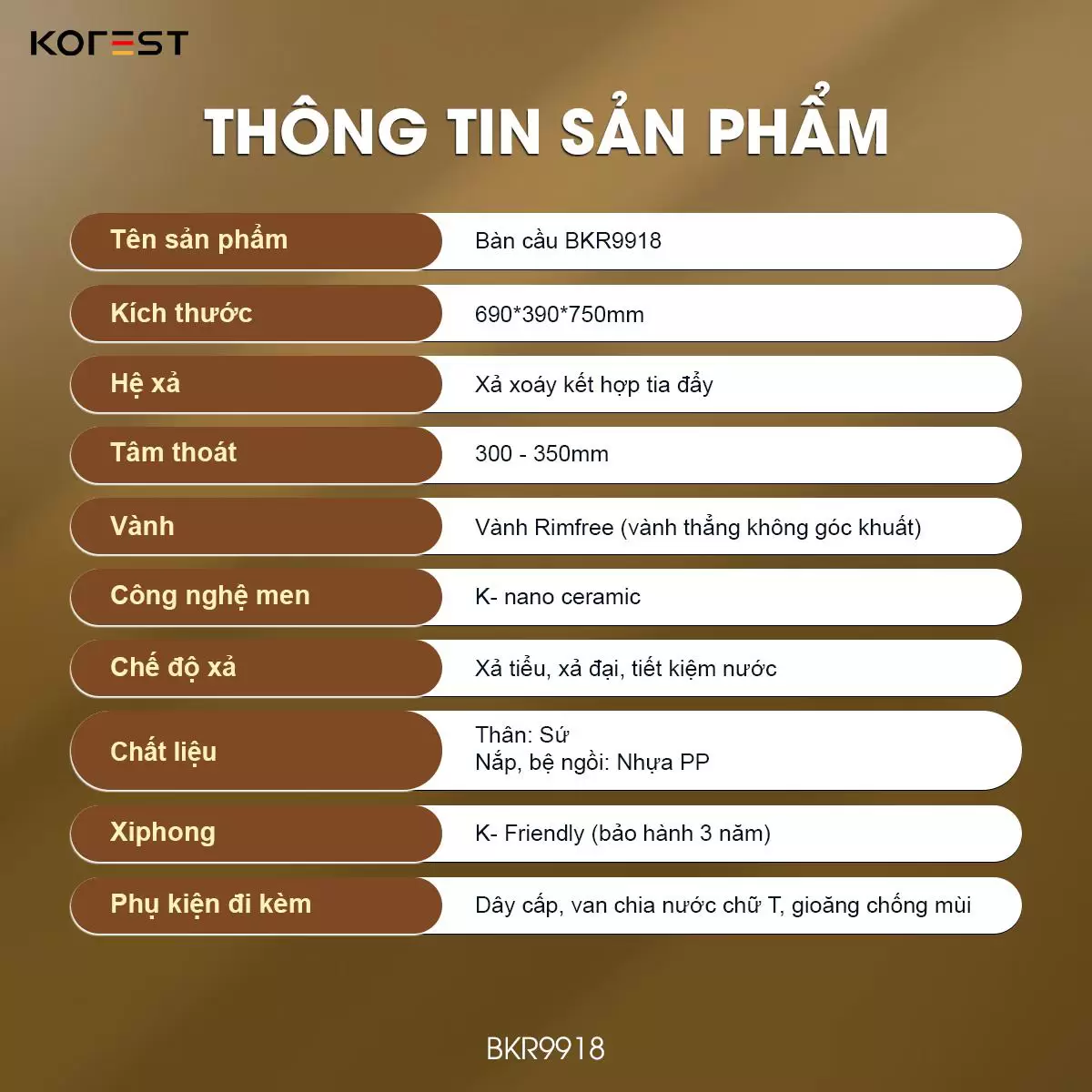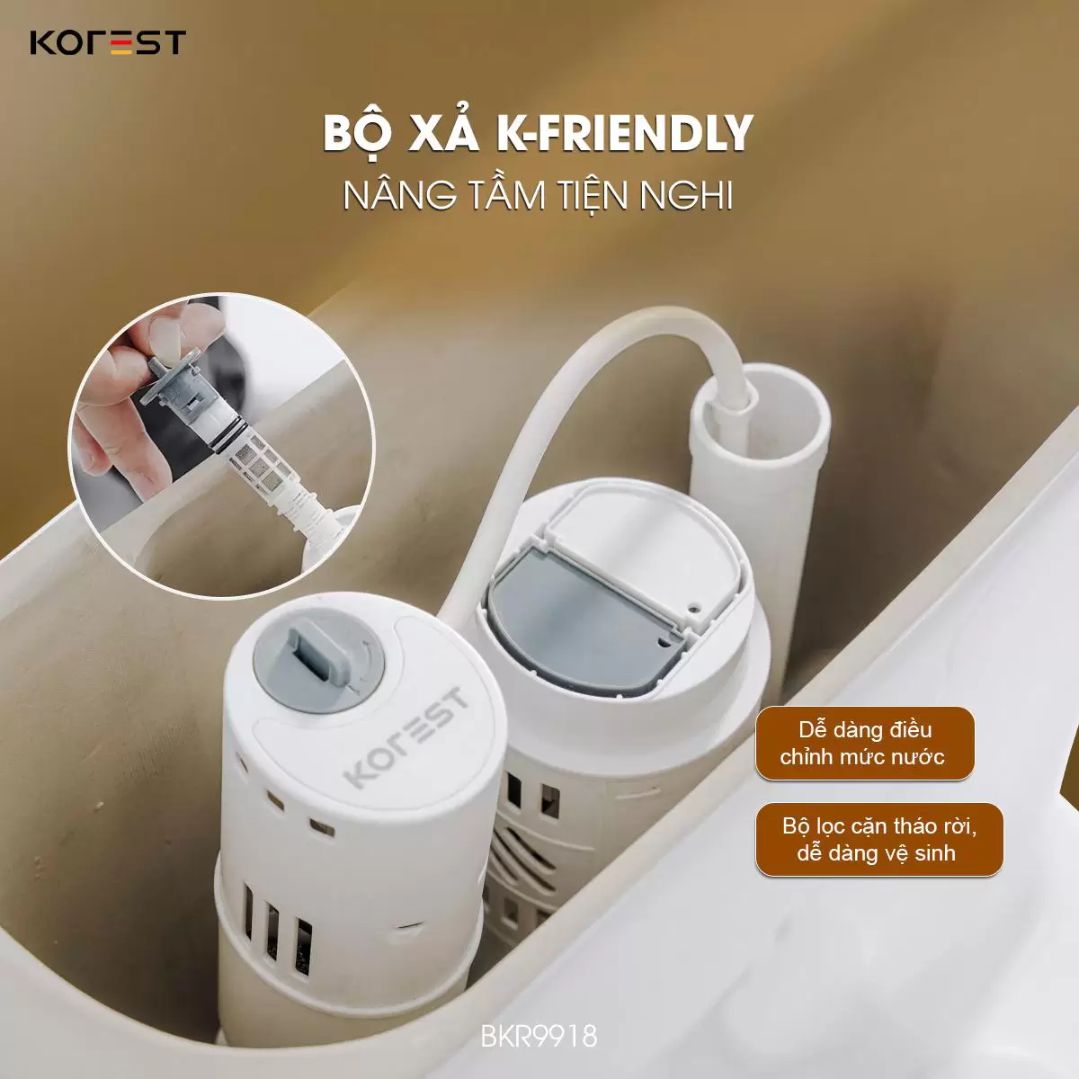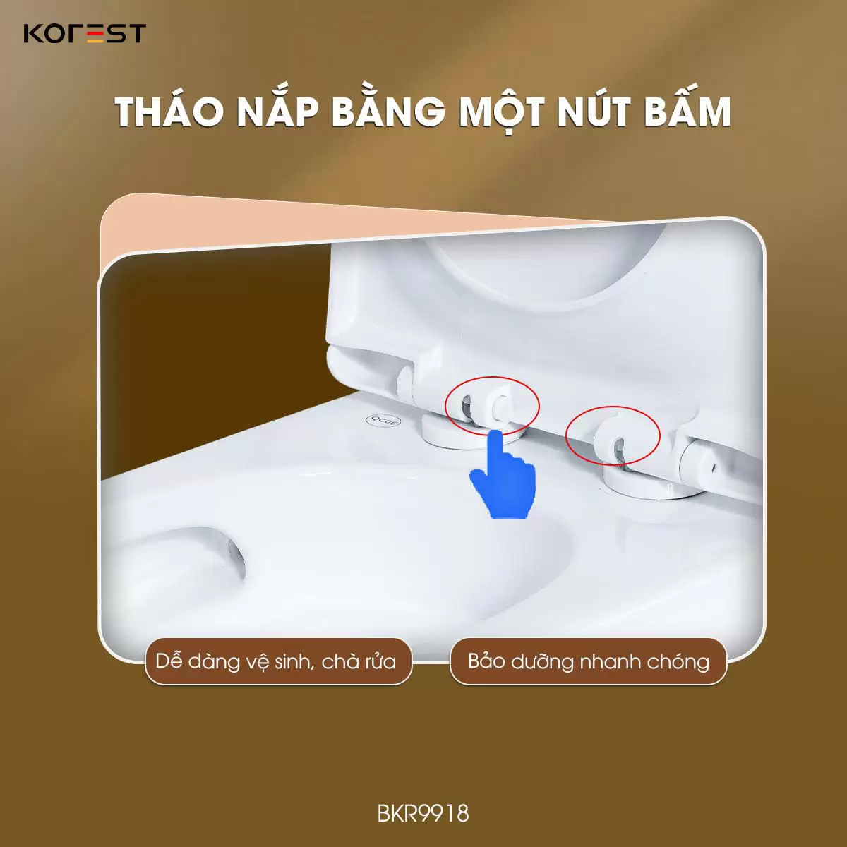 Đơn giản nhưng không đơn điệu, KOREST BKR9918 là lựa chọn hoàn hảo cho những ai yêu thích sự tinh tế trong thiết kế. Kiểu dáng lưng thẳng thanh lịch kết hợp với kích thước tối ưu 690 x 390 x 750mm giúp sản phẩm dễ dàng phù hợp với mọi không gian – từ phòng tắm rộng rãi đến diện tích khiêm tốn. BKR9918 không chỉ làm đẹp cho không gian mà còn mang đến trải nghiệm sử dụng tiện nghi, hiện đại.