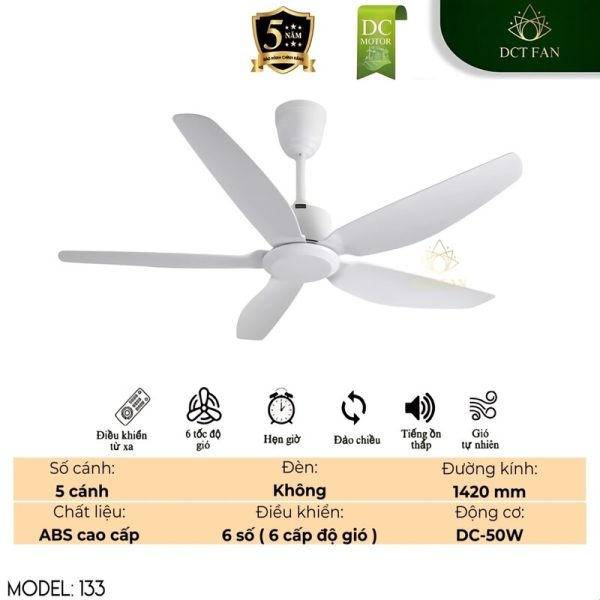 - Thiết kế tối giản, tinh tế: Với 5 cánh nhựa ABS cao cấp và thân quạt được hoàn thiện bằng màu trắng trang nhã, quạt trần DCT FAN 133 mang đến vẻ đẹp hiện đại, tinh tế, dễ dàng hòa hợp với nhiều phong cách nội thất, từ tối giản đến Scandinavian.