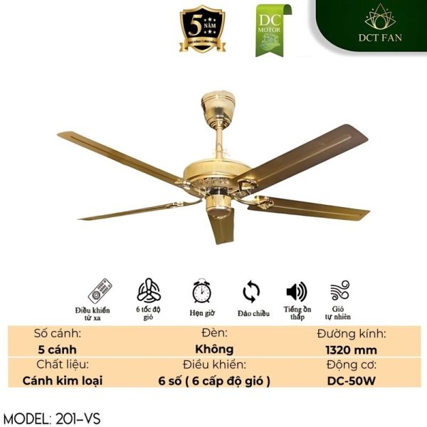 - Thiết kế cổ điển, tinh xảo: Với 5 cánh kim loại và thân quạt được hoàn thiện bằng màu vàng sần (VS) sang trọng, kết hợp với các chi tiết chạm khắc tinh tế, quạt trần DCT FAN 201-VS toát lên vẻ đẹp hoài cổ, đẳng cấp, là điểm nhấn hoàn hảo cho các không gian nội thất mang phong cách cổ điển, tân cổ điển hay Indochine.