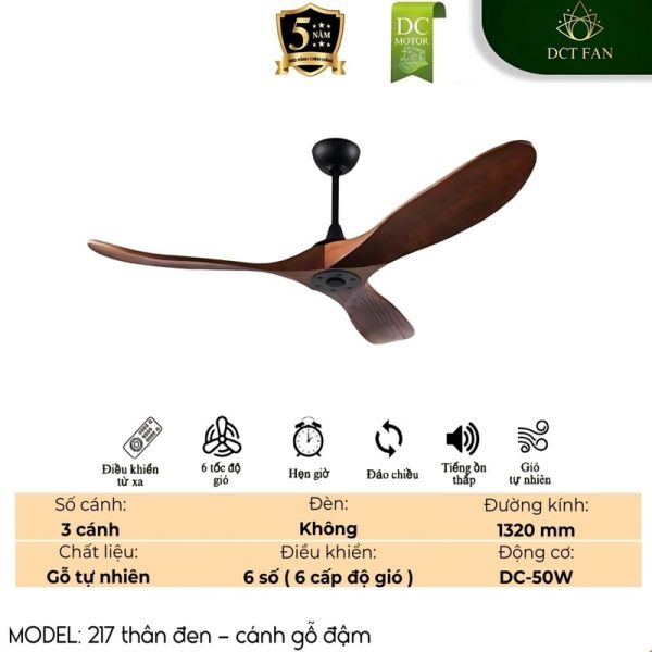 Quạt Trần DCT FAN 217 | Thân Đen – Cánh Gỗ Đậm | 3 Cánh Gỗ Tự Nhiên | Ø1320mm | Động cơ DC-50W | Không Đèn