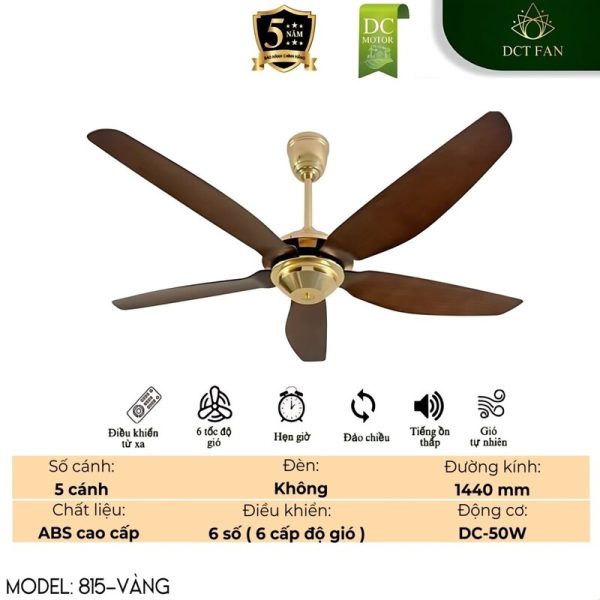 - Thiết kế sang trọng, tinh tế: Với 5 cánh nhựa ABS cao cấp vân gỗ đậm và thân quạt được hoàn thiện bằng màu vàng đồng sang trọng, quạt trần DCT FAN 815 mang đến vẻ đẹp hiện đại, tinh tế, dễ dàng hòa hợp với nhiều phong cách nội thất, từ cổ điển đến đương đại.