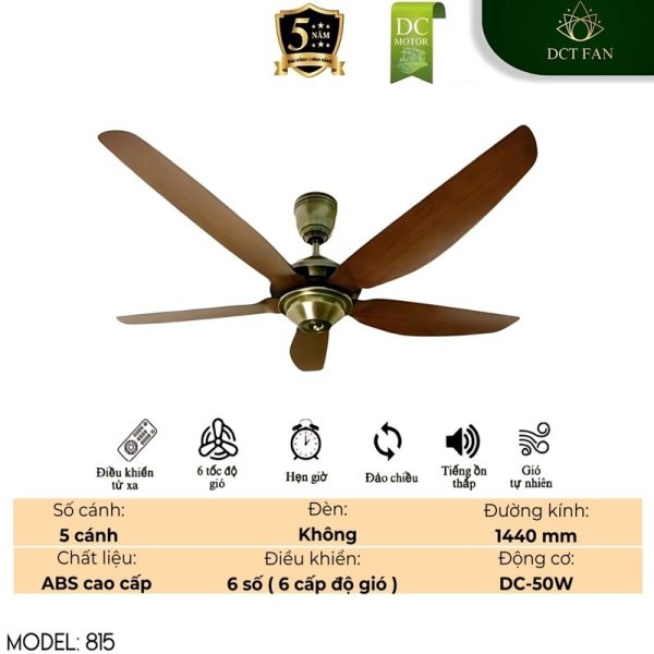 - Thiết kế cổ điển, sang trọng: Với 5 cánh nhựa ABS cao cấp vân gỗ và thân quạt được hoàn thiện bằng màu đồng cổ điển, quạt trần DCT FAN 815 mang đến vẻ đẹp hoài cổ, tinh tế, dễ dàng hòa hợp với nhiều phong cách nội thất, từ tân cổ điển đến Indochine.