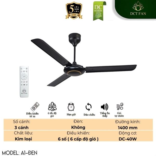 Quạt Trần DCT FAN A1-Đen | 3 Cánh Kim Loại | Ø1400mm | Động cơ DC-40W | Remote 6 số | Không Đèn