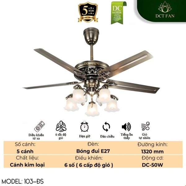 Quạt Trần Đèn Chùm DCT FAN 103-ĐS | Cánh kim loại | Bóng đui E27