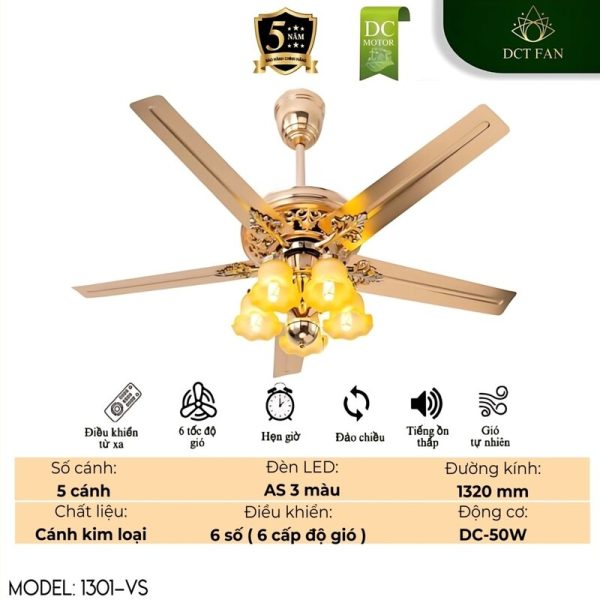 Thêm một nét chấm phá hoàng gia, sang trọng và đẳng cấp vào không gian sống của bạn với quạt trần trang trí DCT FAN Model 1301-VS. Sản phẩm là sự hòa quyện tinh tế giữa thiết kế cổ điển với gam màu vàng sắt lộng lẫy, động cơ DC êm ái, tiết kiệm điện và hàng loạt tính năng thông minh, hứa hẹn không chỉ mang đến làn gió mát lành mà còn nâng tầm đẳng cấp cho mọi căn phòng.