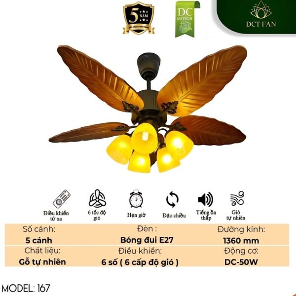 - Thiết kế lá cọ nhiệt đới độc đáo: Với 5 cánh quạt được chế tác tinh xảo từ gỗ tự nhiên, mô phỏng hình dáng chiếc lá cọ, quạt trần DCT FAN 167 mang đến một vẻ đẹp đầy nghệ thuật, gần gũi với thiên nhiên, tạo nên điểm nhấn ấn tượng cho mọi không gian.
