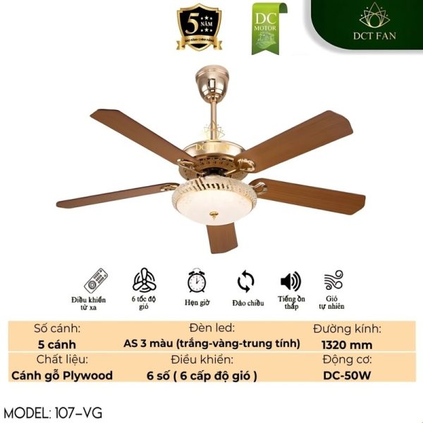 Mang đến vẻ đẹp cổ điển, tinh tế cùng khả năng làm mát vượt trội và ánh sáng đa năng cho không gian sống của bạn với quạt trần đèn LED DCT FAN 107-VG. Sản phẩm là sự kết hợp hoàn hảo giữa thiết kế 5 cánh gỗ Plywood sang trọng, chao đèn họa tiết cổ điển, động cơ DC siêu tiết kiệm điện, đèn LED chiếu sáng 3 màu và hàng loạt tính năng thông minh, hứa hẹn nâng tầm đẳng cấp cho mọi căn phòng và mang lại sự thoải mái tối đa.