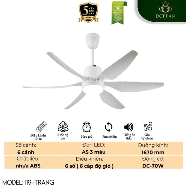 - Thiết kế hiện đại, tinh khôi với 6 cánh nhựa ABS màu trắng: Với 6 cánh quạt làm từ nhựa ABS cao cấp màu trắng tinh khiết, kiểu dáng cong mềm mại, kết hợp với bầu đèn LED tối giản, quạt trần DCT FAN 119 mang đến vẻ đẹp hiện đại, nhẹ nhàng, dễ dàng hòa hợp với nhiều phong cách nội thất, đặc biệt là những không gian ưa chuộng sự sáng sủa, thanh lịch và tối giản.