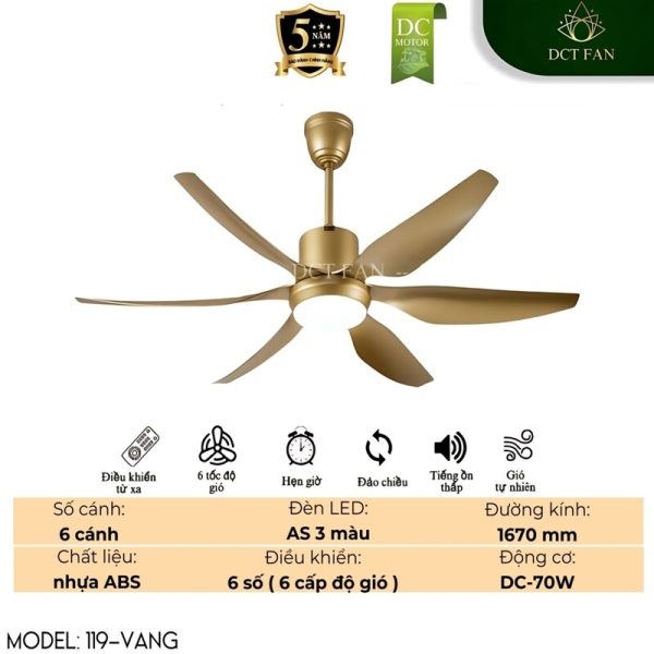 Quạt Trần Đèn LED DCT FAN 119-Vàng | 6 cánh nhựa ABS cao cấp | LED AS 3 màu (trắng/vàng/trung tính)