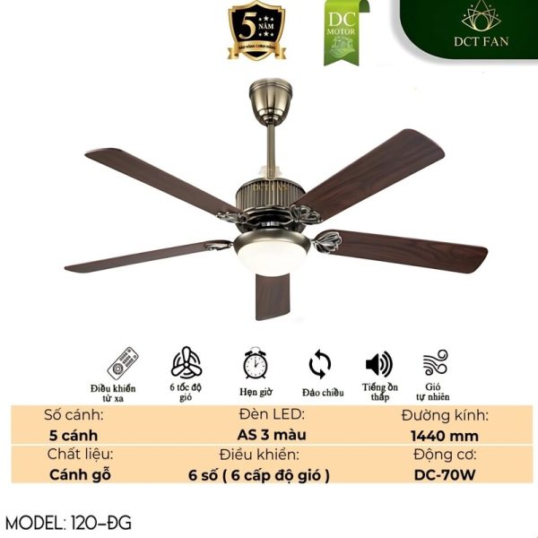 Mang đến sự kết hợp hoàn hảo giữa vẻ đẹp cổ điển, công nghệ chiếu sáng hiện đại và khả năng làm mát vượt trội cho không gian sống của bạn với quạt trần trang trí DCT FAN Model 120-ĐG. Sản phẩm nổi bật với đèn LED đổi 3 màu tiện lợi, sải cánh lớn 1440mm, động cơ DC 70W mạnh mẽ, tiết kiệm điện năng và thiết kế cánh gỗ Plywood sang trọng trên nền thân quạt màu đồng, hứa hẹn nâng tầm đẳng cấp cho ngôi nhà và mang lại sự thoải mái tối ưu cho những căn phòng có diện tích lớn.