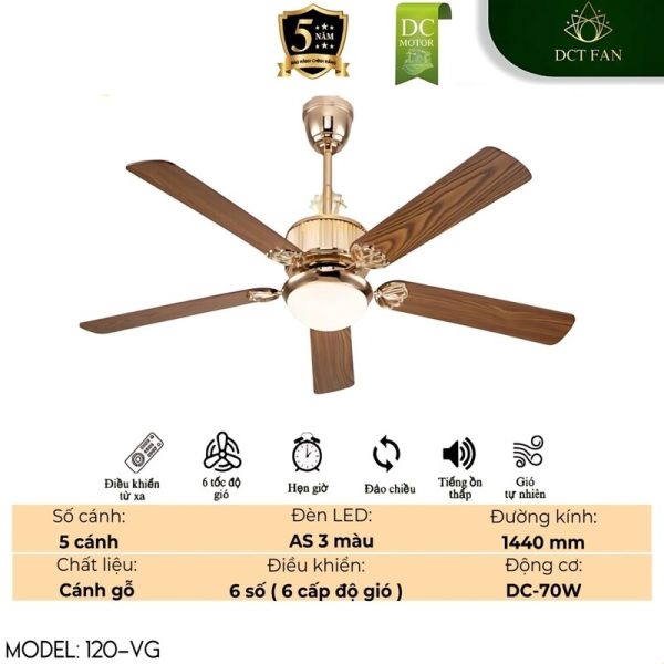 Quạt Trần Đèn LED DCT FAN 120-VG | Động cơ DC-70W tiết kiệm 70% điện năng | LED AS 3 màu
