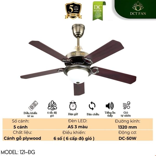Mang đến sự kết hợp hoàn hảo giữa vẻ đẹp cổ điển, công nghệ chiếu sáng hiện đại và khả năng làm mát vượt trội cho không gian sống của bạn với quạt trần trang trí DCT FAN Model 121-ĐG. Sản phẩm nổi bật với đèn LED đổi 3 màu tiện lợi, động cơ DC êm ái, tiết kiệm điện năng và thiết kế cánh gỗ Plywood sang trọng trên nền thân quạt màu đồng, hứa hẹn nâng tầm đẳng cấp cho ngôi nhà và mang lại sự thoải mái tối ưu.