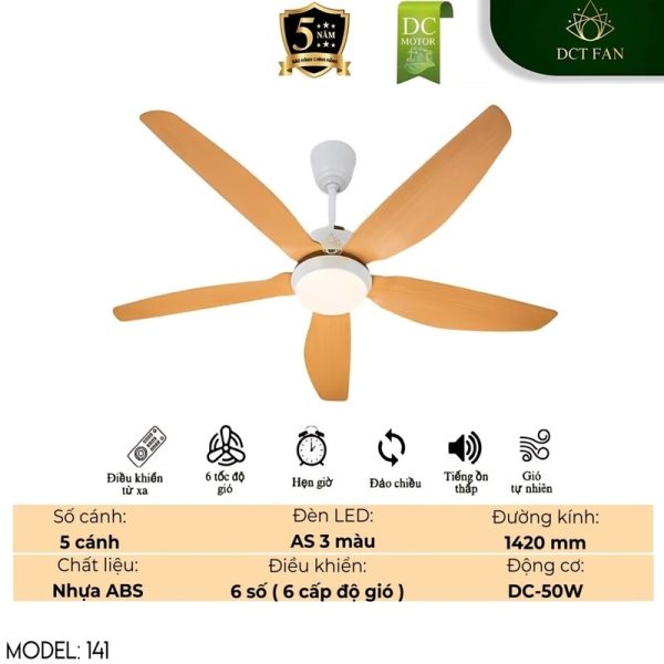 - Thiết kế hiện đại, cánh nhựa ABS vân gỗ: Với 5 cánh quạt làm từ nhựa ABS cao cấp, tạo hình vân gỗ sồi sáng màu tự nhiên và tinh tế, kết hợp với thân quạt trắng trang nhã, quạt trần DCT FAN 141 mang đến vẻ đẹp vừa hiện đại, vừa ấm cúng, dễ dàng hòa hợp với nhiều phong cách nội thất.