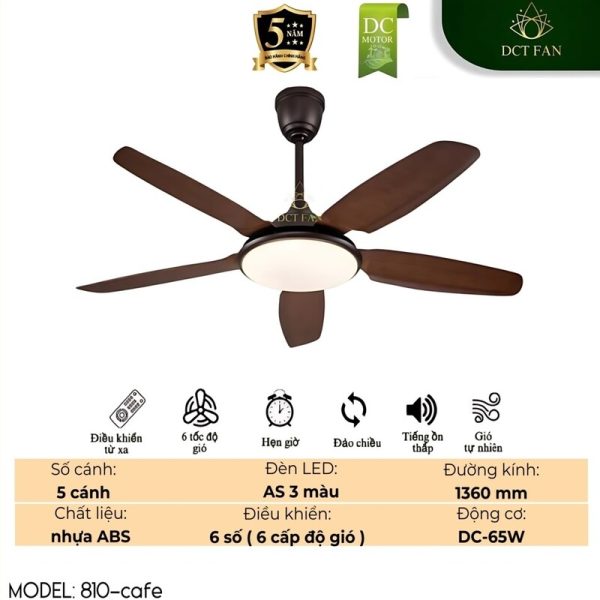 - Thiết kế ấm cúng, sang trọng với cánh nhựa ABS màu cafe: Với 5 cánh quạt làm từ nhựa ABS cao cấp màu cafe trầm ấm, kết hợp với bầu đèn LED tối giản, quạt trần DCT FAN 810 mang đến vẻ đẹp hiện đại, sang trọng và đầy ấm cúng, dễ dàng hòa hợp với nhiều phong cách nội thất, đặc biệt là những không gian ưa chuộng sự gần gũi và tinh tế.